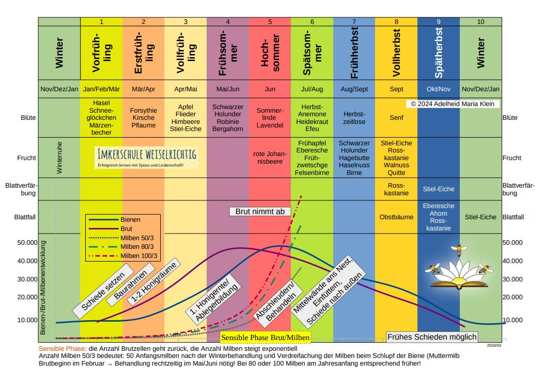 Das ganze Jahr, nicht nur im Sommer: steigt die Milbenzahl zu früh stark an, komme ich mit der Behandlung im Sommer zu spät und die Bienen werden kurzlebig. Dann ist im Oktober oder Februar schon Schluss und die Bienen schaffen es nicht ein neues Brutnest im kommenden Frühling zu starten.